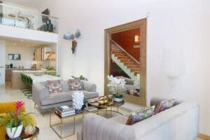 This contemporary living area leads out on to a generous patio and garden with panoramic views to the mountains and sea, and the golf course in-between.